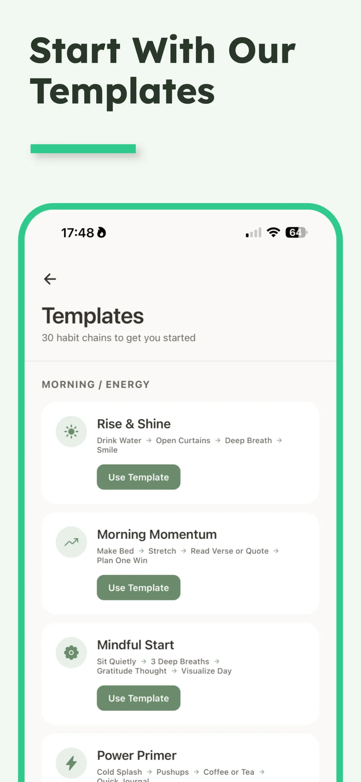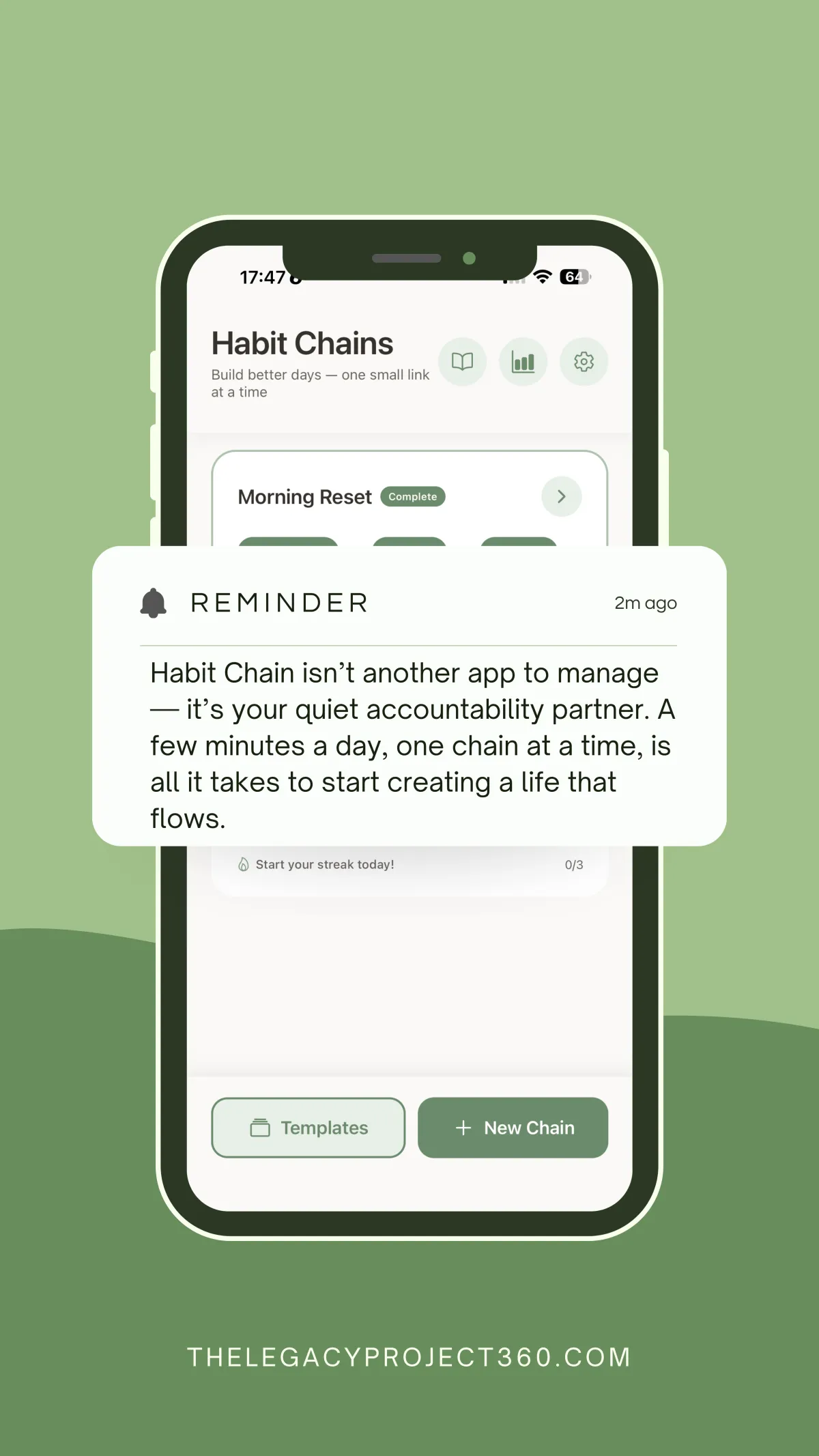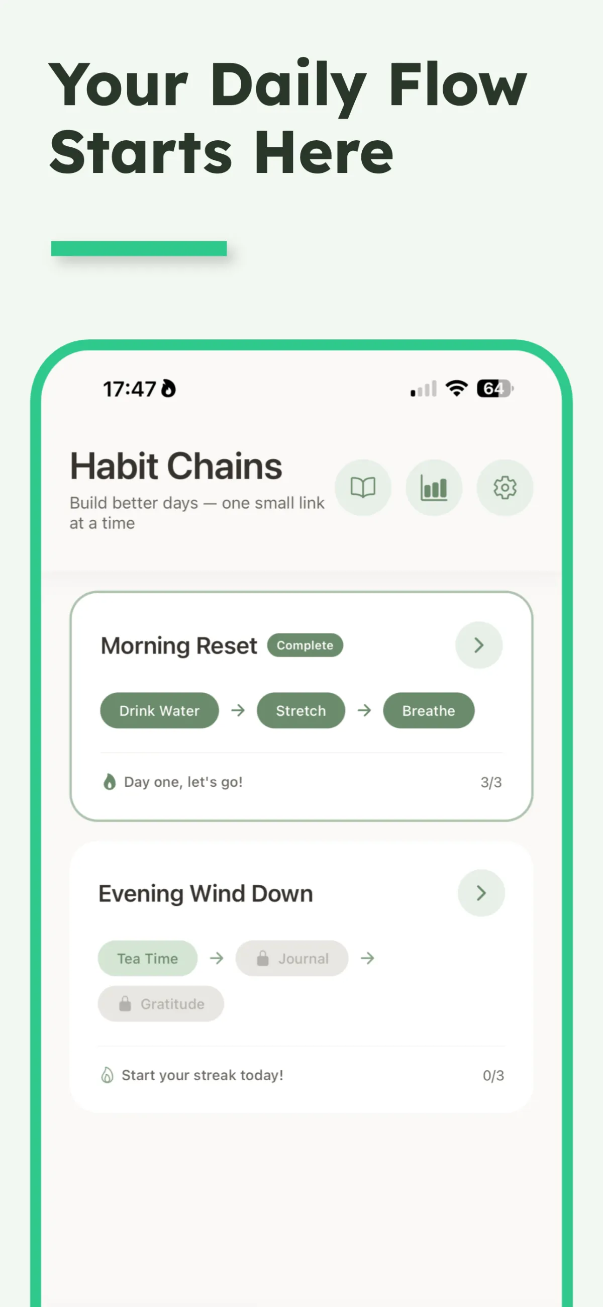 Habit Chain is the simplest way to build better days through small, connected habits. Create custom habit chains or start from 30+ proven templates that help you stay focused, consistent, and in control of your daily routine. Designed for clarity, calm, and the way real people actually live — Habit Chain keeps your growth private, your progress visual, and your momentum effortless.